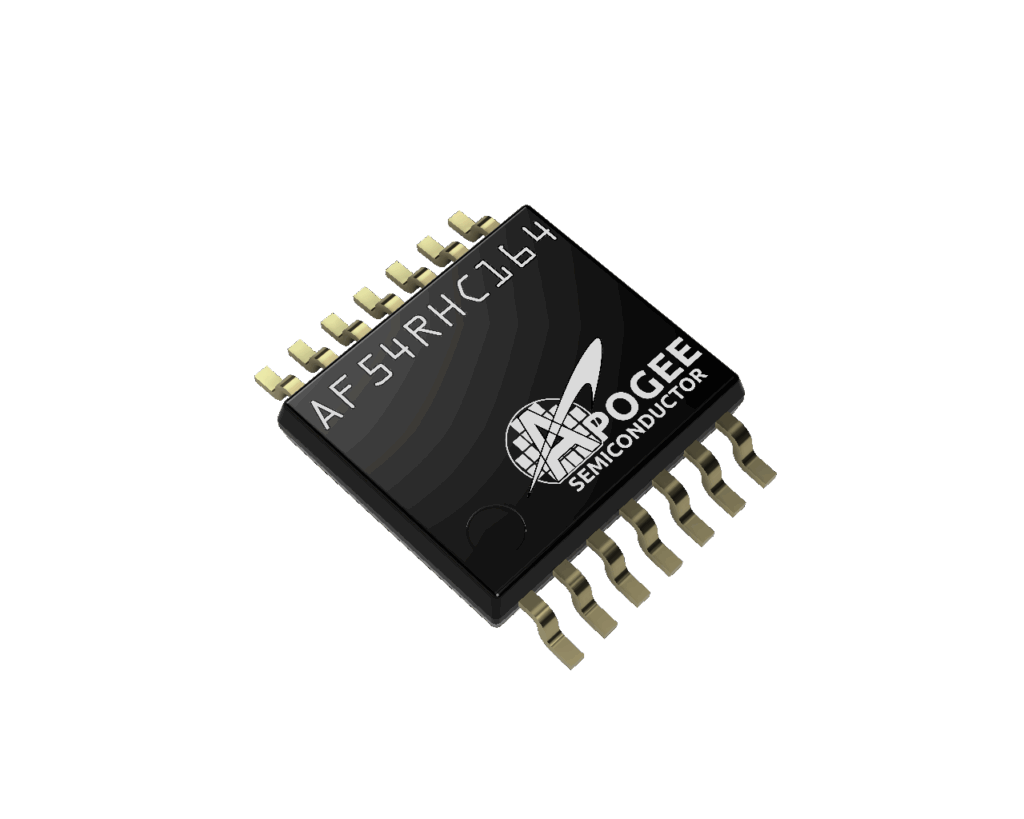 The AF54RHC164 is a radiation-hardened-by-design 8-bit Serial-In Parallel-Out Shift Register (SIPO) for space, medical imaging, and high-energy physics applications, built on a 180 nm CMOS process with proprietary hardening for resilience to single-event effects and total ionizing dose up to 300 krad(Si). As a member of Apogee Semiconductor’s AF54RHC logic family, it operates from 1.65 V to 5.5 V supply and uses a fully triple-redundant architecture to provide immunity to single-event transients without external redundancy.